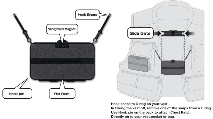 ●The chest patch attached to the center will ease the access to your flies and improve usability, unlike conventional fly patches that are attached to the left ior right sides of the vest.