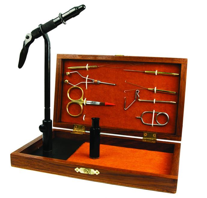 Terra Fireside Tool Kit. This compact Fireside Tool Kit contains the 9 essential, quality fly tying tools needed to tie flies: A pedestal vise, bobbin, bodkin, bobbin threader, scissors, dubbing tool, hackle plier, whip finisher, and hair stacker. All packaged in an attractive wooden box that is perfect for travel. The base for the pedestal vise is mounted directly into the box making it easy to tie flies with the box sitting open in your lap or on any tabletop.