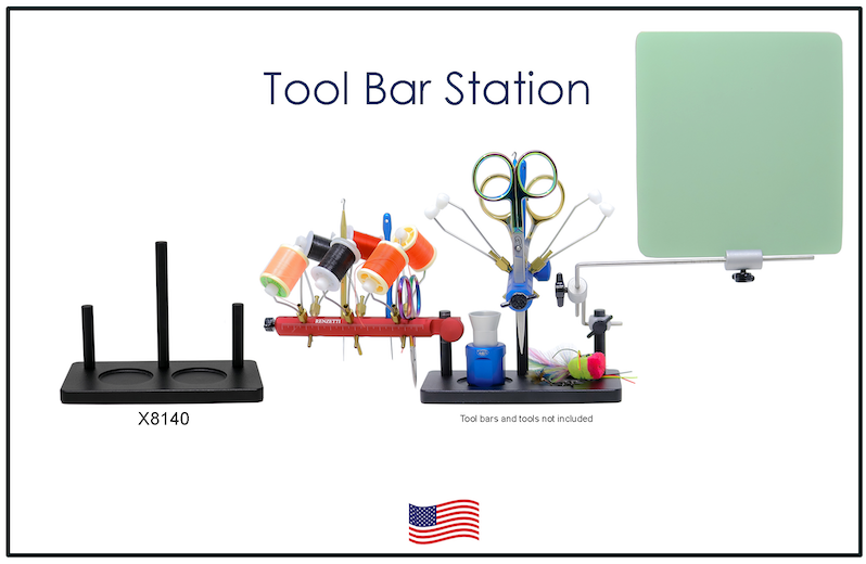 A perfect tool organizer that can be placed anywhere on the tying desk! It comes with (2) 2” stems and (1) 4” stem along with a 3”X6” black coated plate. The pockets within the coated plate are magnetized to help organize and secure hooks, eyes, and beads closely to the vise for production tying or increased speed of tying the fly. ALL Renzetti Tool Bars can be used on this new organizer and the Renzetti Enhancement Plate can now be free from the vise allowing for added space around the vise.