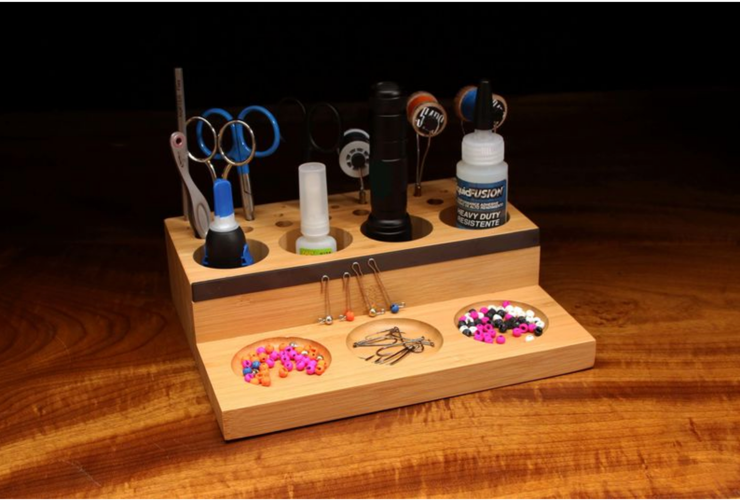 Great way to organize your tying desk - has slots for various sizes of tools, as well as dishes for hooks and beads.