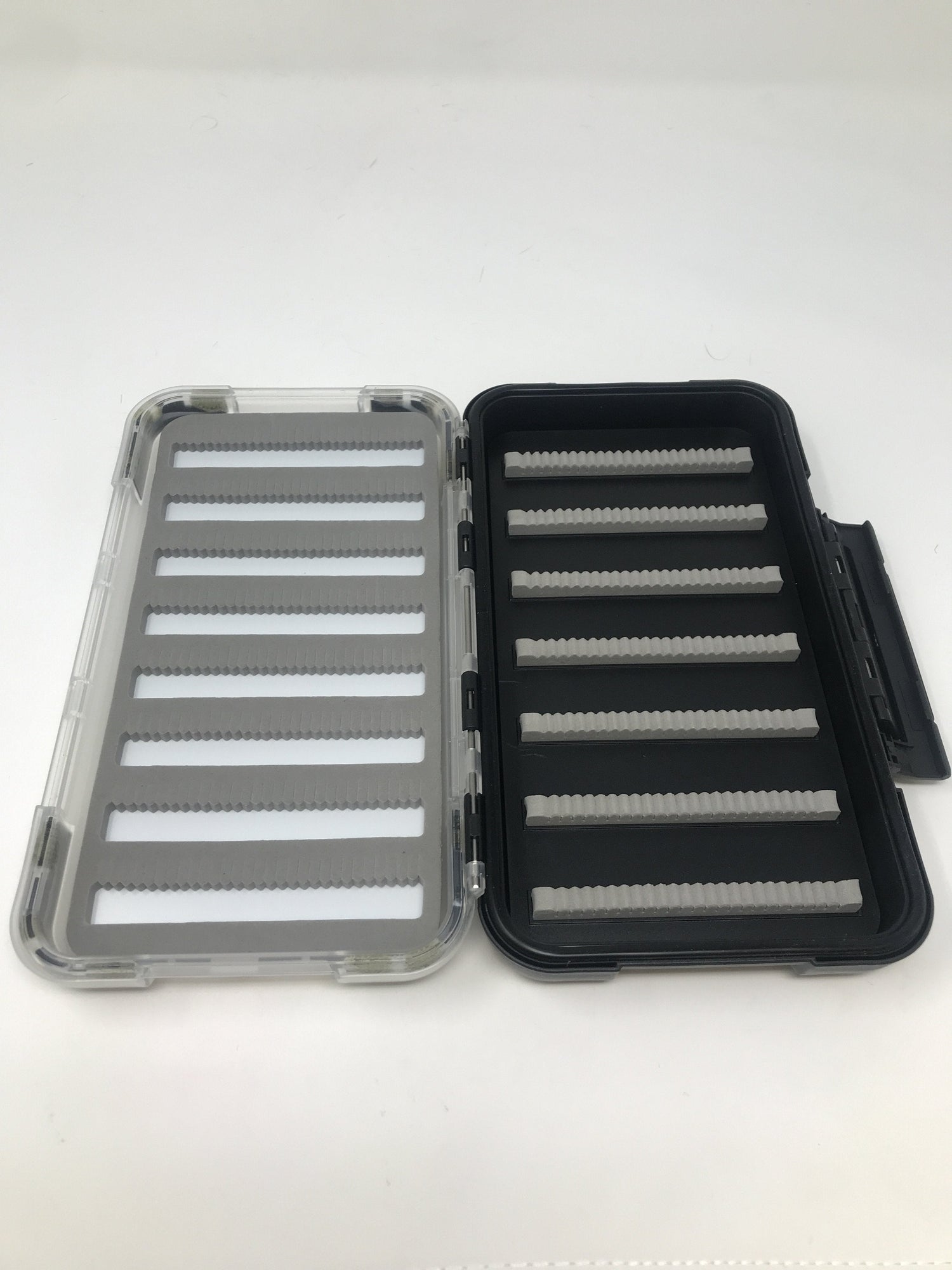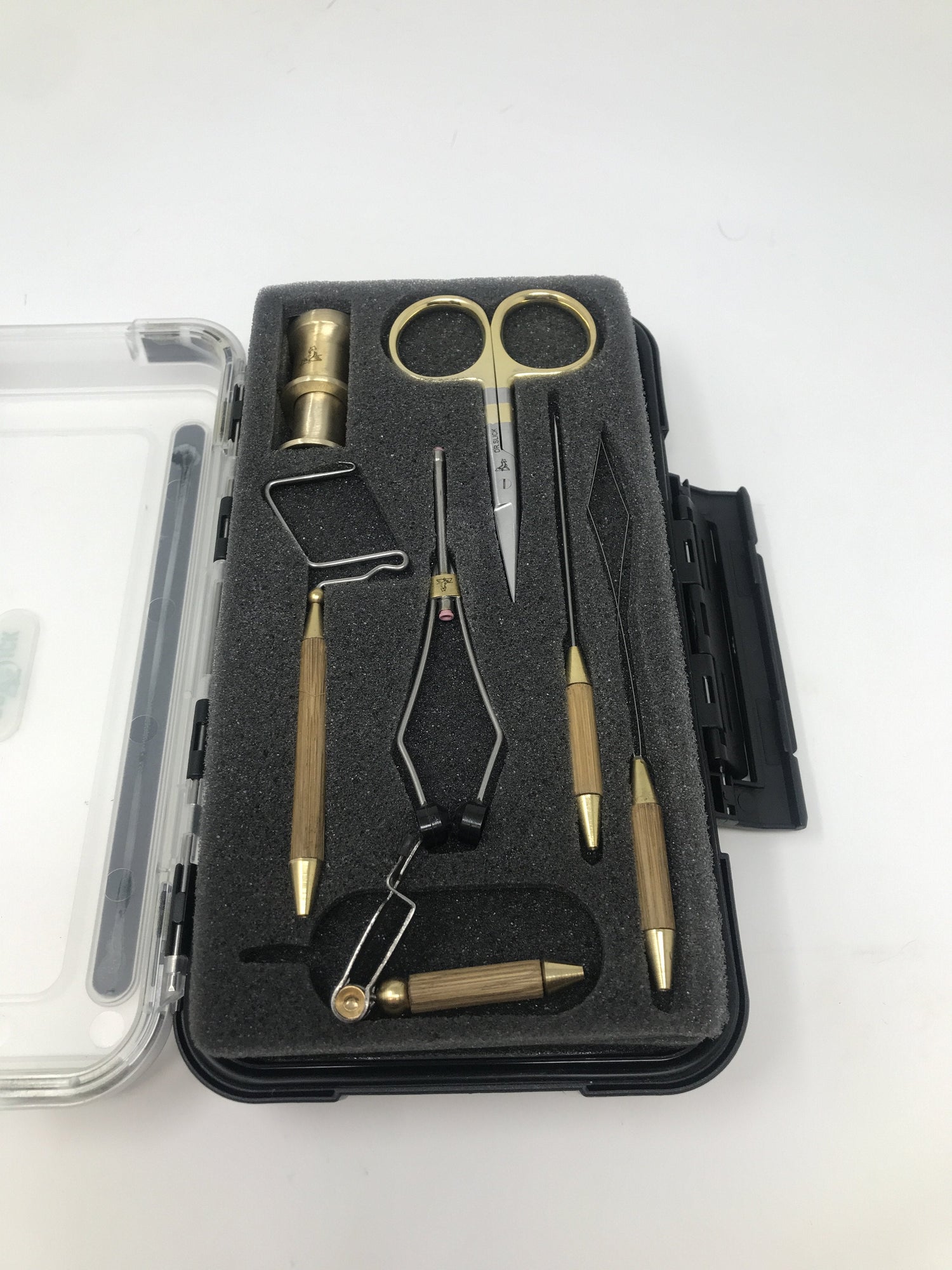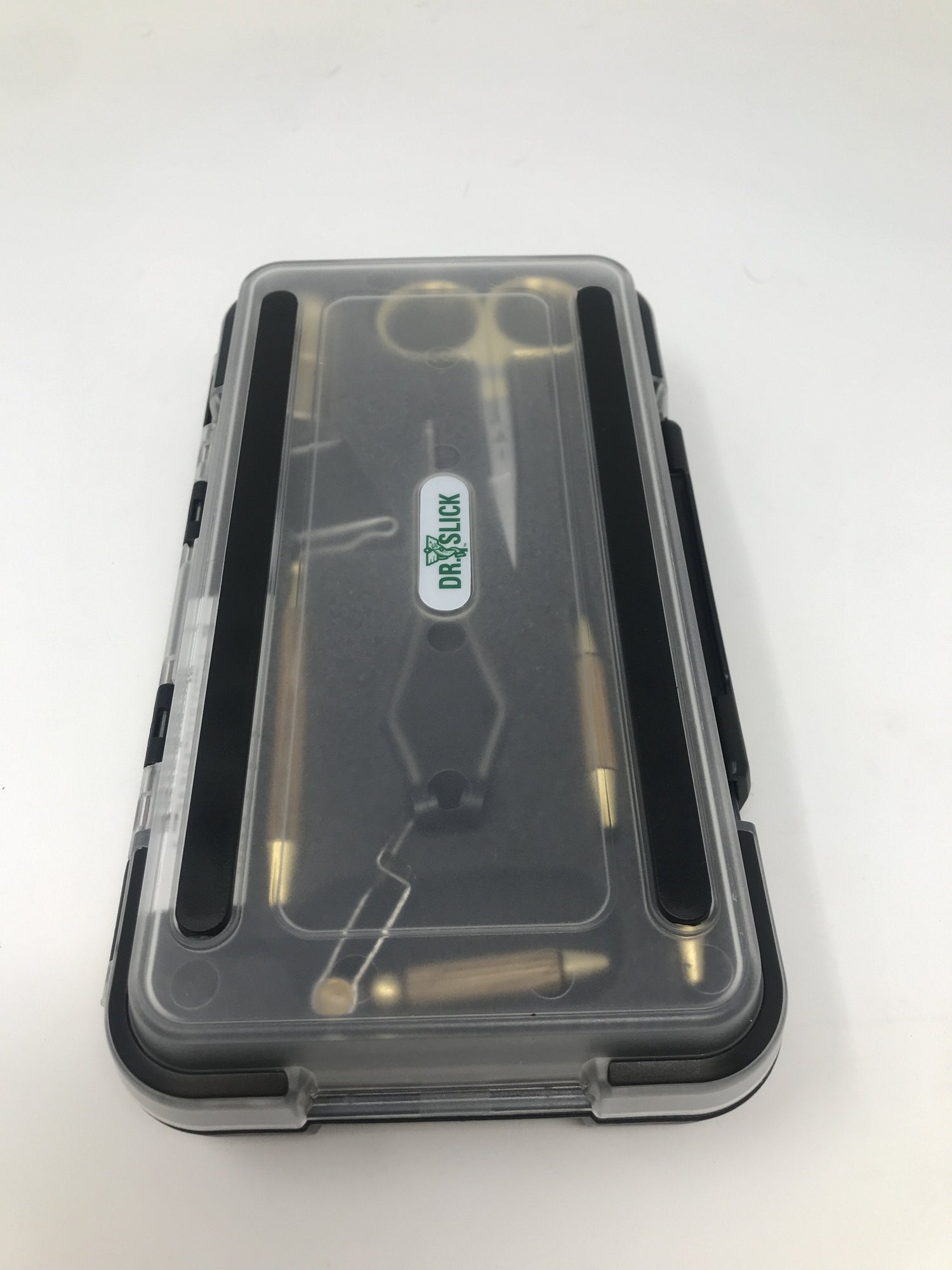 Dr. Slick bamboo tying tools in large fly box with ripple foam inserts.