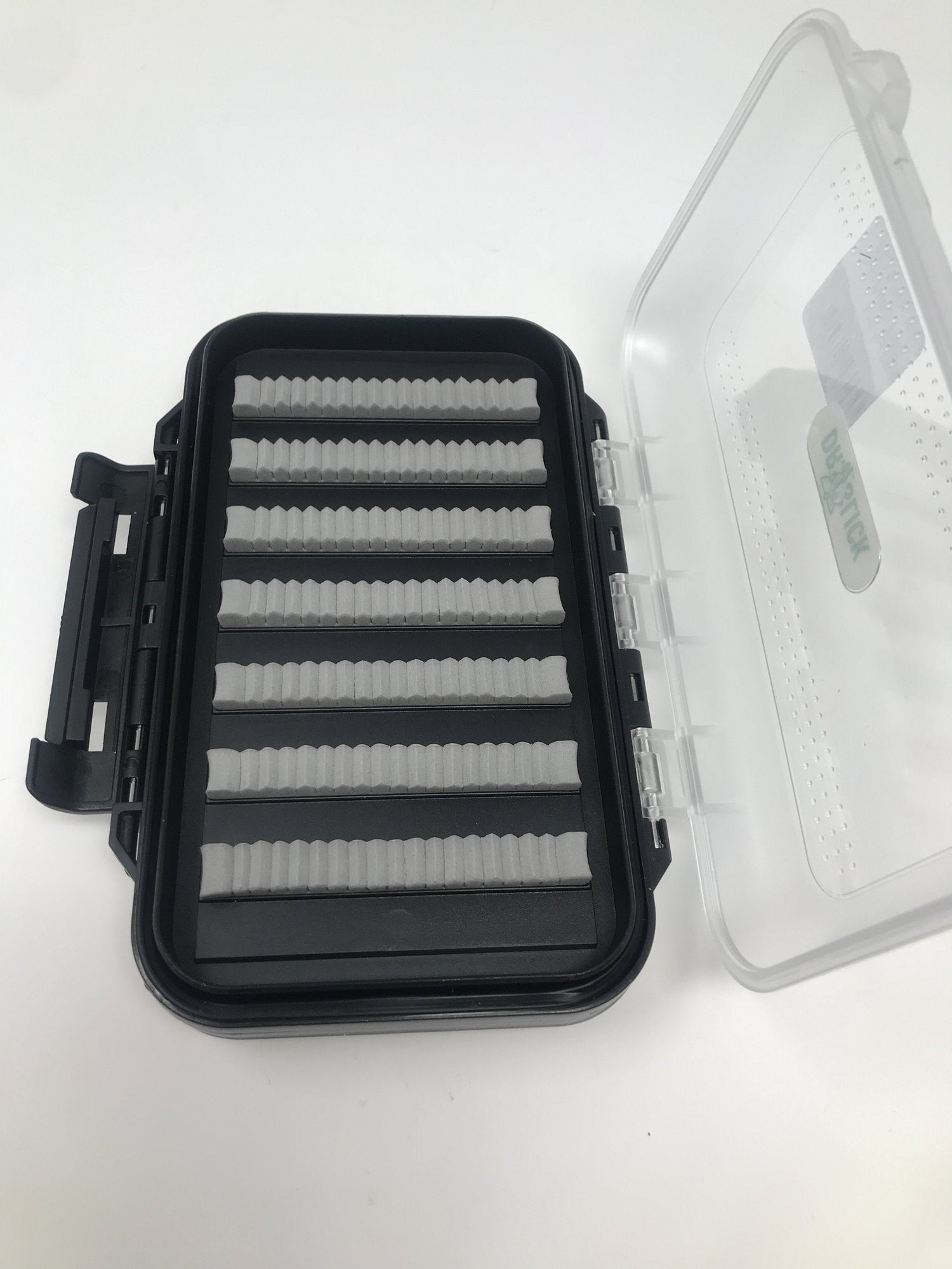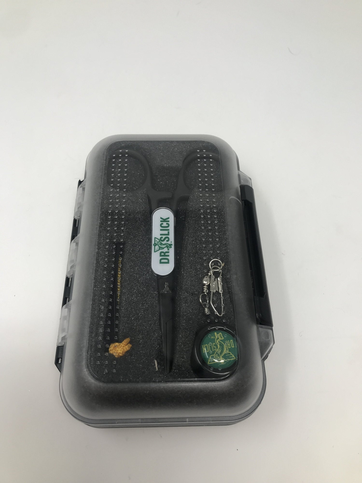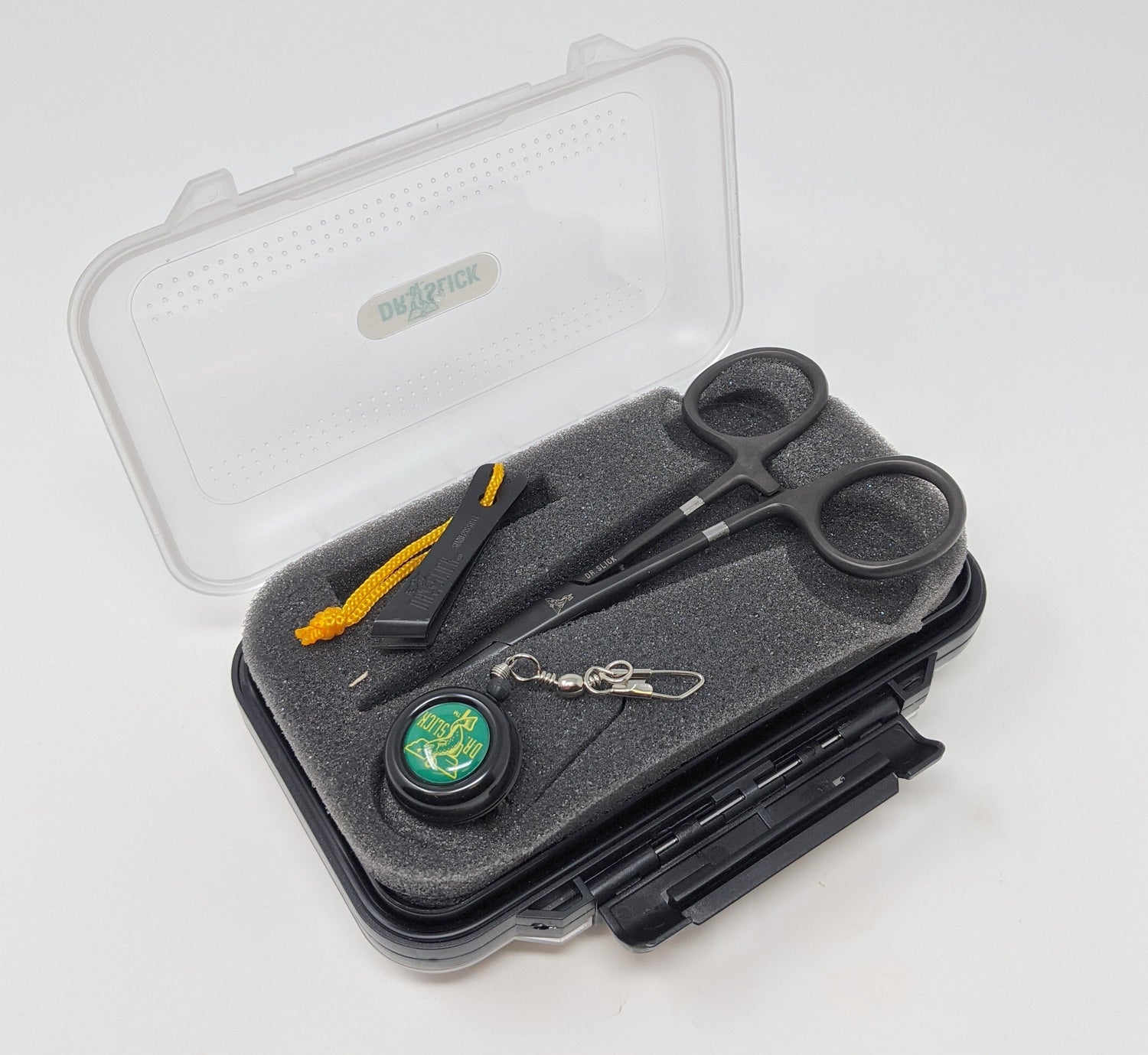 Dr. Slick nipper, reel and 5" black clamp in small fly box with ripple foam inserts