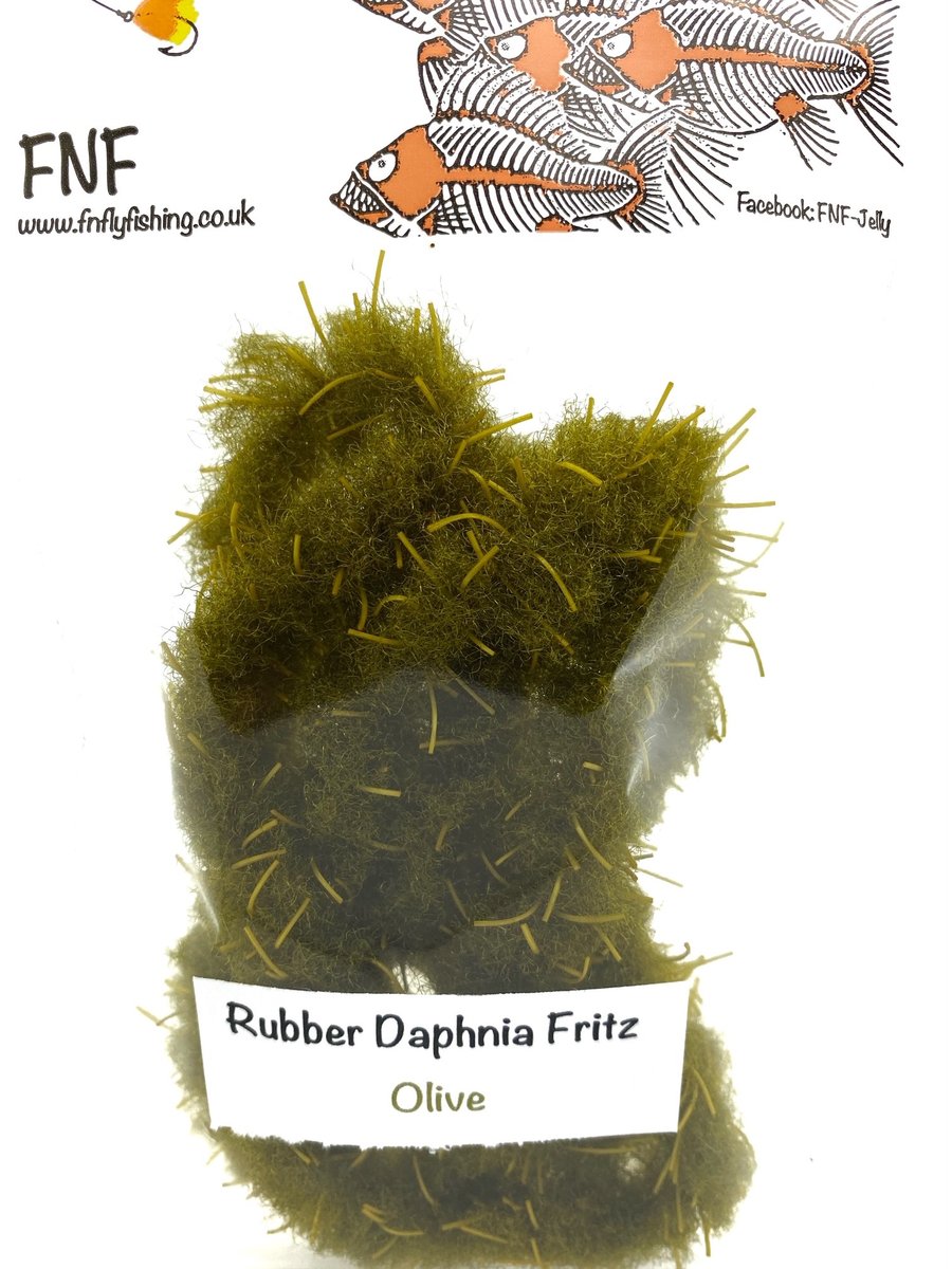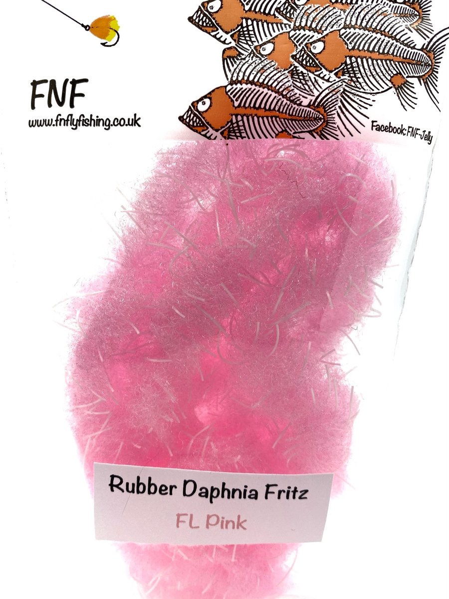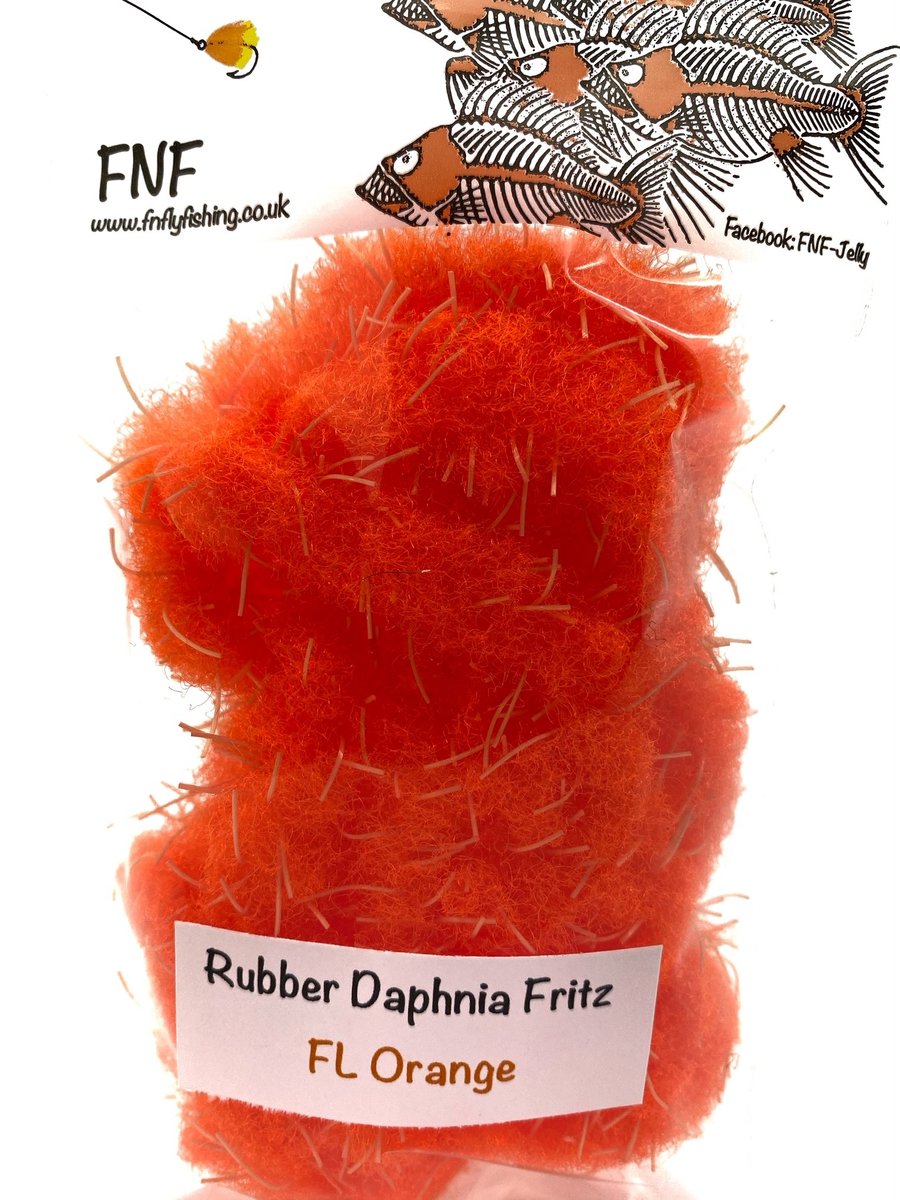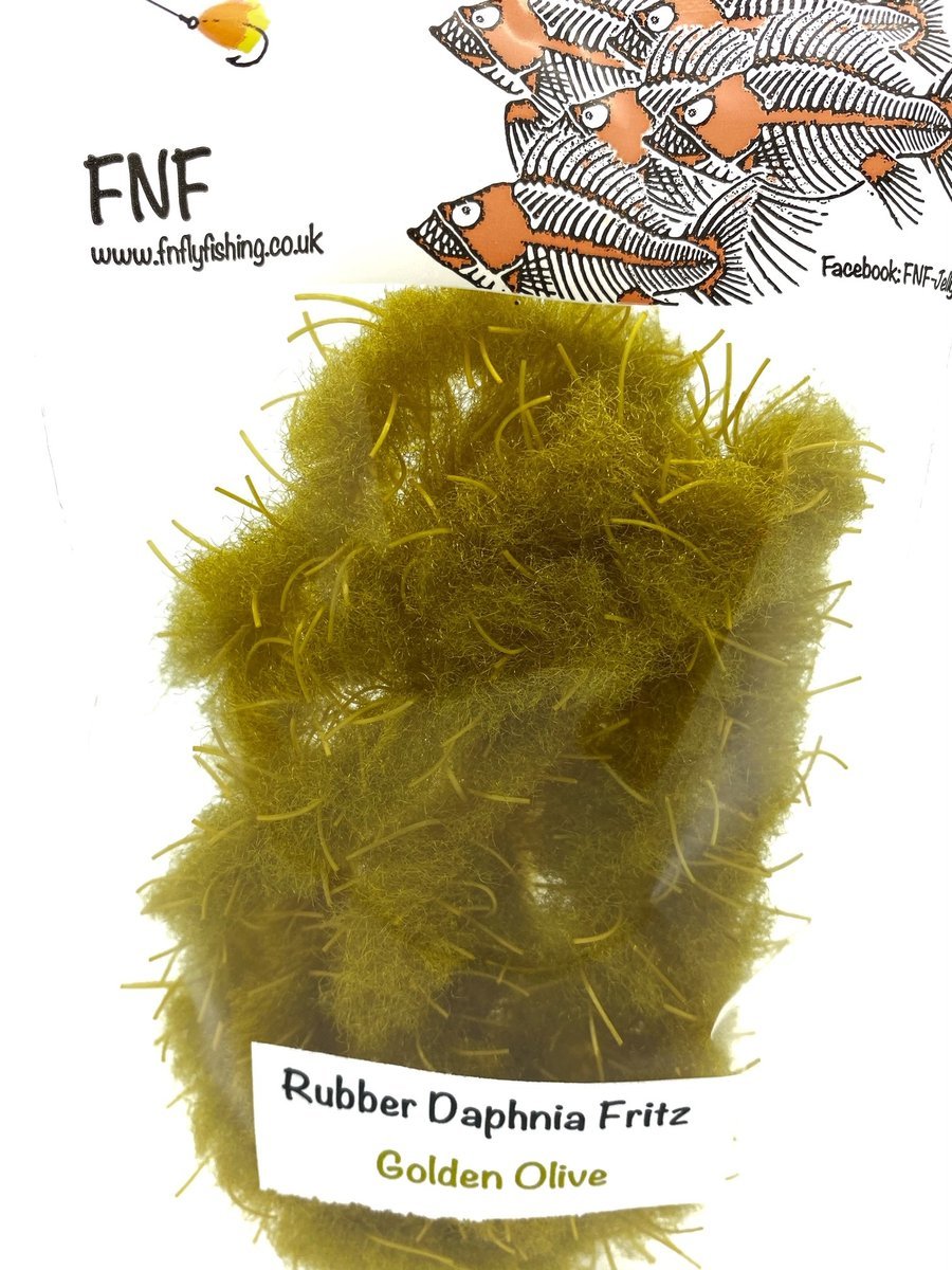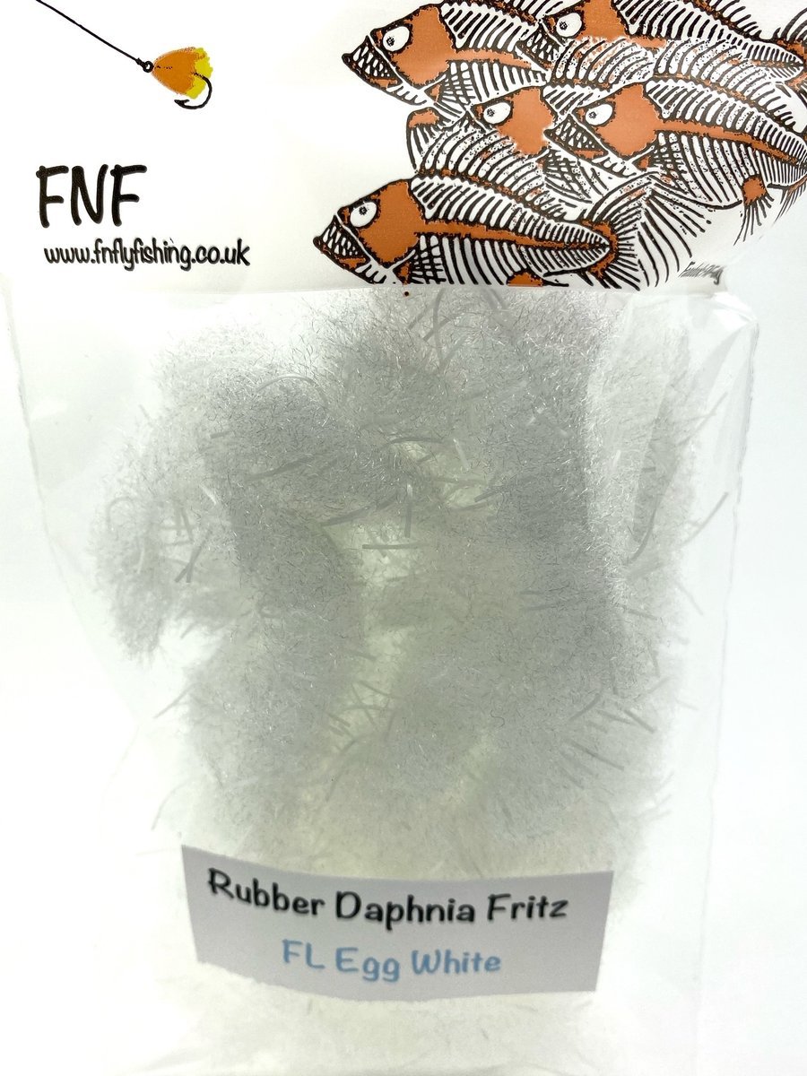 FNF Rubber Daphnia Fritz - FNF have taken our already popular Daphnia material and incorporated rubber filaments to give it a more buggy feel. This material is 20mm so will require wide gape hooks or trimmed underneath so as not to mask hook points. Fulling Mill short shank size 8 or larger is generally required. The fiber is translucent and allows other materials and beads to bleed through. Daphnia and Rubber Daphnia are both excellent materials for sculpting shapes like frogs or fry patterns. This material makes fantastic egg patterns with the rubber helping keep the egg profile and add a little extra appeal through the soft rubber. Use some Velcro to tease out the fibers for a lovely look when using egg patterns.