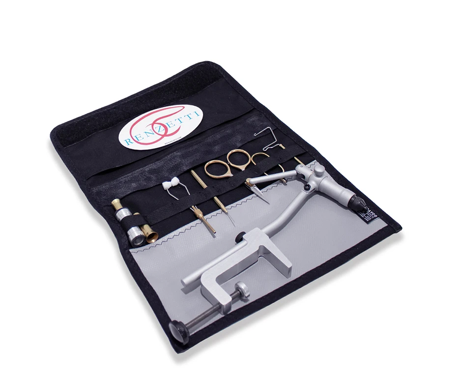 Renzetti Apprentice Vise Kit - This Kit includes: Renzetti Standard Ruby Tip Bobbin, Renzetti Small Dubbing Needle, Renzetti Standard Double Hair Stacker, Dr Slick 4" Razor Scissors, Dr. Slick Whip Finisher and Dr. Slick Hackle Pliers, all in a very nice and protective pouch to ensure your tools of trade are well protected and secured. The case is manufactured in the USA by Vedavoo. The Apprentise Kit come with a Midge Ruby Tip Bobbin and a Midge Double Hair Stacker as well as Dr Slick tools listed.