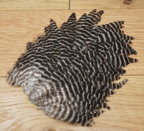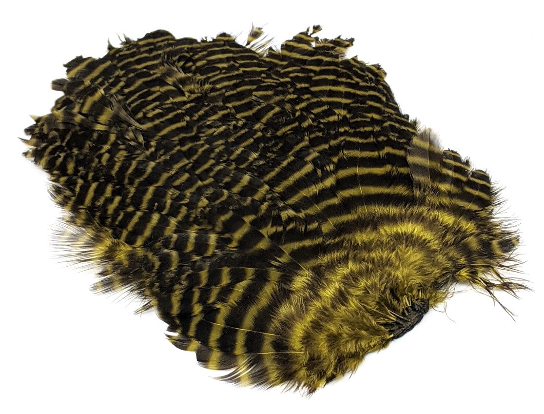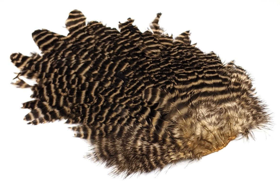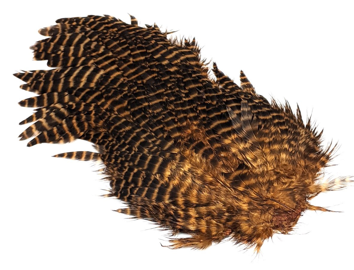 Wapsi Grizzly Hen Saddle- Perfect for large soft hackle applications like big streamers, saltwater flies, steelhead flies, and especially bass poppers! Lots of wide, webby feathers in a wide variety of sizes.