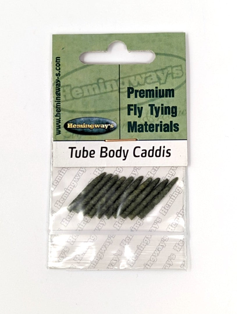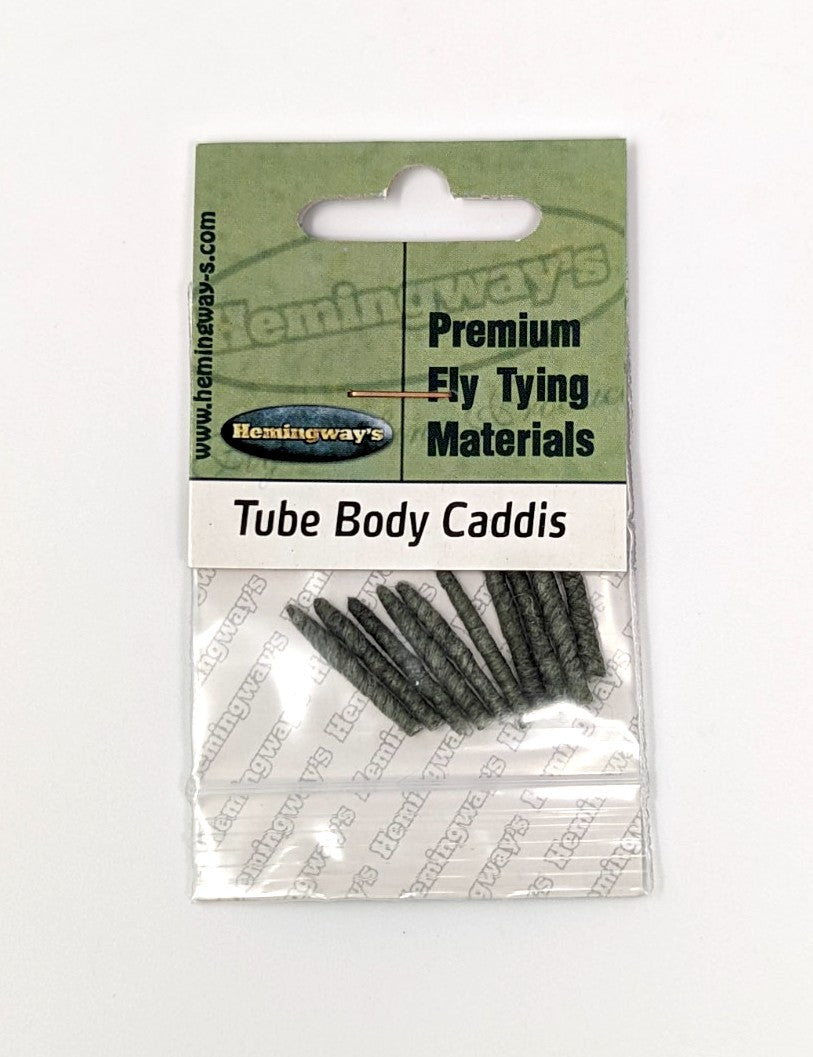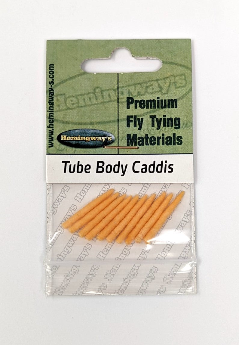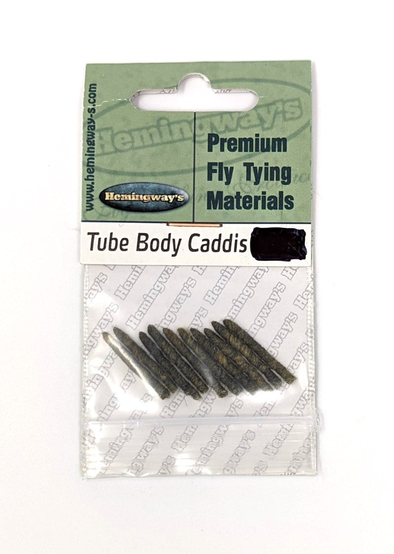 Hemingway's Caddis Tube Body- Tube fly bodies for caddis. Tie an extended body caddis quickly with these realistic bodies. Tie to length off the back of the hook (use a short shank dry fly hook such as the Firehole 413), Tie in the Wing, and finish with a few wraps of hackle.