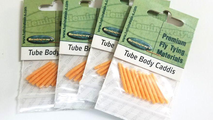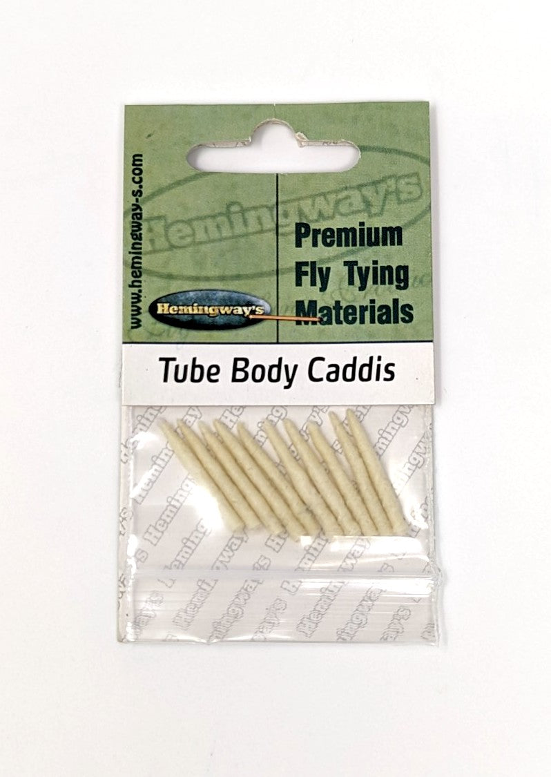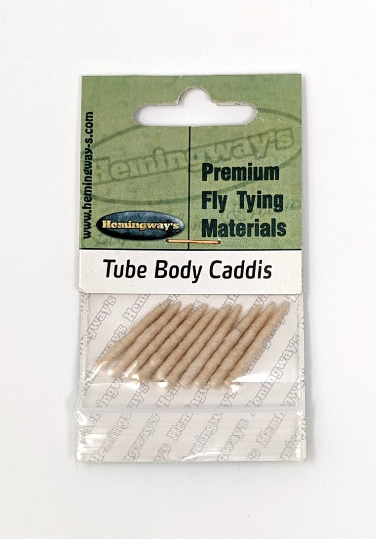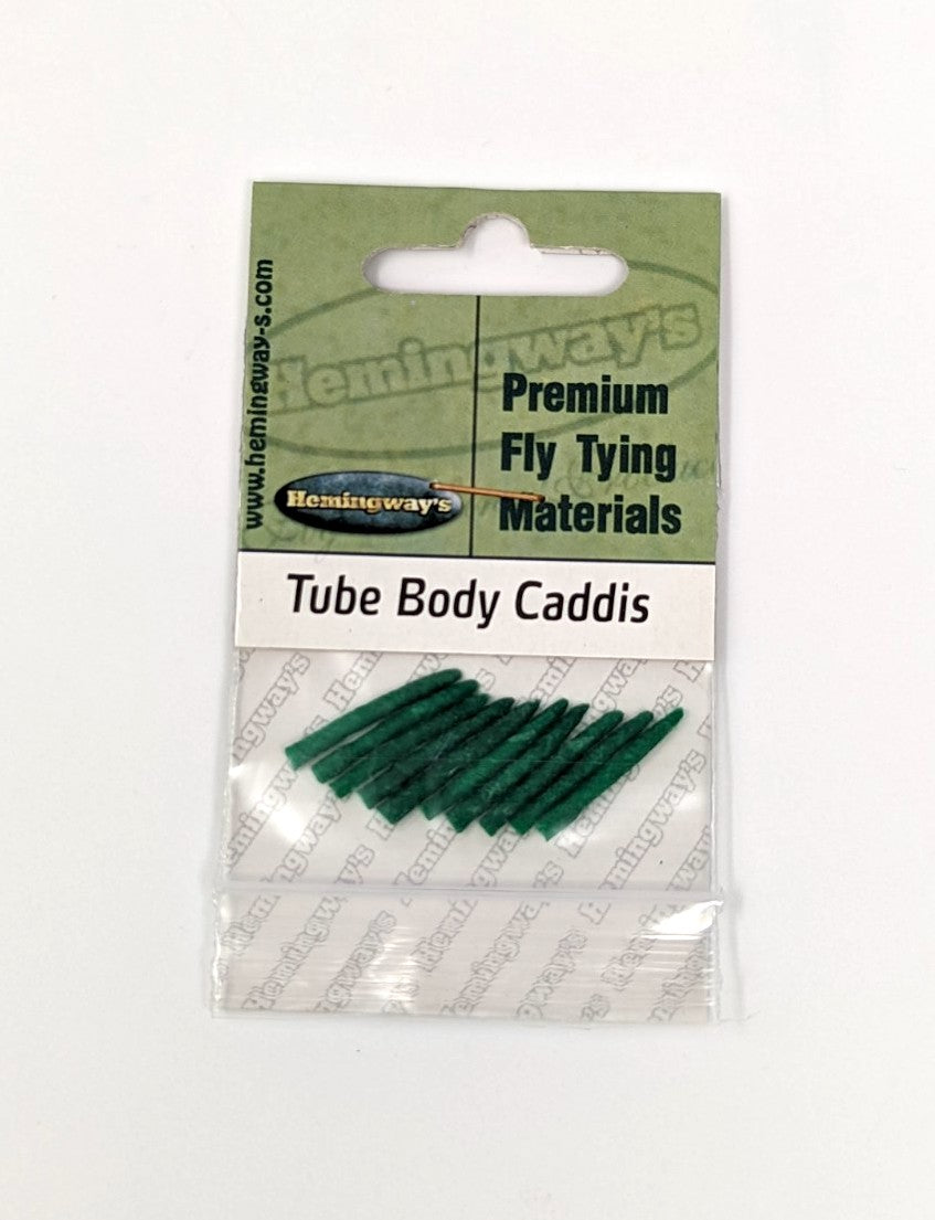 Hemingway's Caddis Tube Body- Tube fly bodies for caddis. Tie an extended body caddis quickly with these realistic bodies. Tie to length off the back of the hook (use a short shank dry fly hook such as the Firehole 413), Tie in the Wing, and finish with a few wraps of hackle.