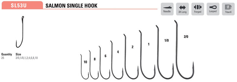 The SL53UAP is a single salmon hook with a 3X long, looped-up eye and a tapered design. It is suitable for modern and traditional patterns. It is especially effective for low-water applications in smaller sizes. The innovative TitanX matte gunmetal finish minimizes glare for improved stealth while fishing.
