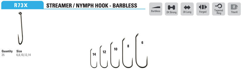 For a barbless alternative to the R73AP, try the Mustad Streamer Hook 9671 2XH 3XL. Designed with a round bend and down eye, this 2X strong and 3X long hook is perfect for streamers, lures, and long-shank nymphs. This hook features the innovative TitanX matte gunmetal finish, offering increased stealth and reduced glare. Plus, with 4.8 AlphaPoint® Technology and an Opti-Angle Needle Point, the R73XAP is ideal for freshwater fishing. Try it for yourself with this 25-pack.