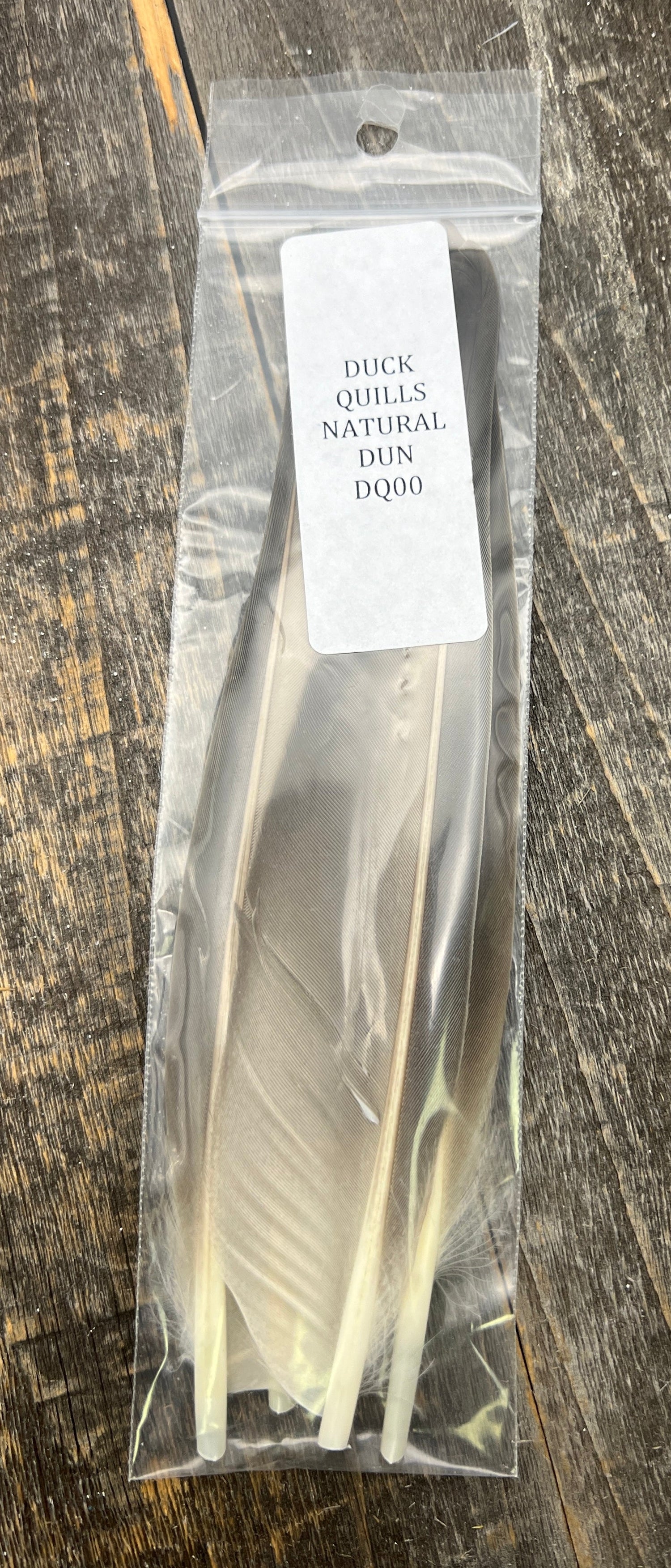 Duck Quills 2 Pair Natural - These feathers are about seven inches from base to tip. They are used quite often for dry flies and emergers, as they are great for floatation. Try using as wings on classic wet flies, or no hackles.
