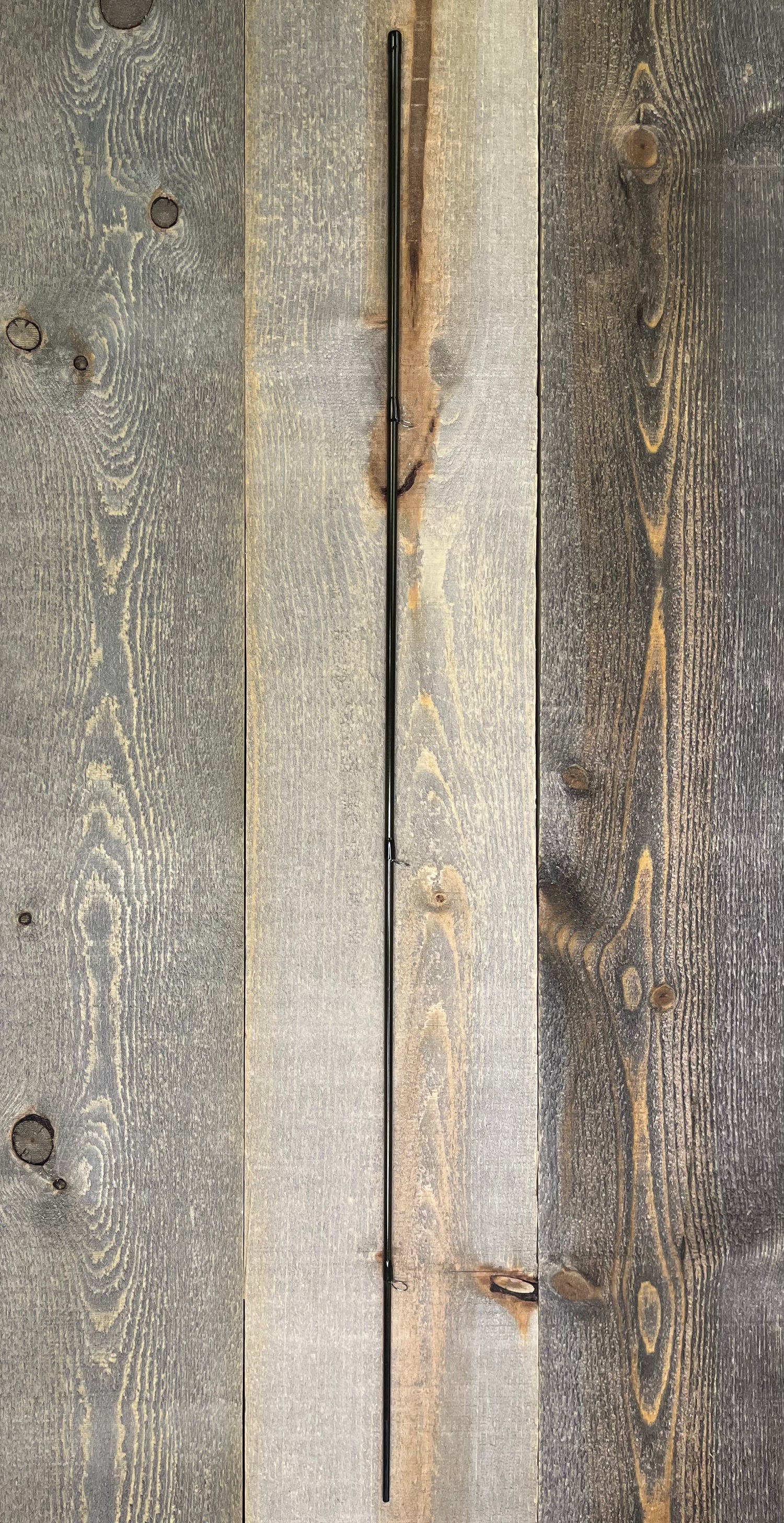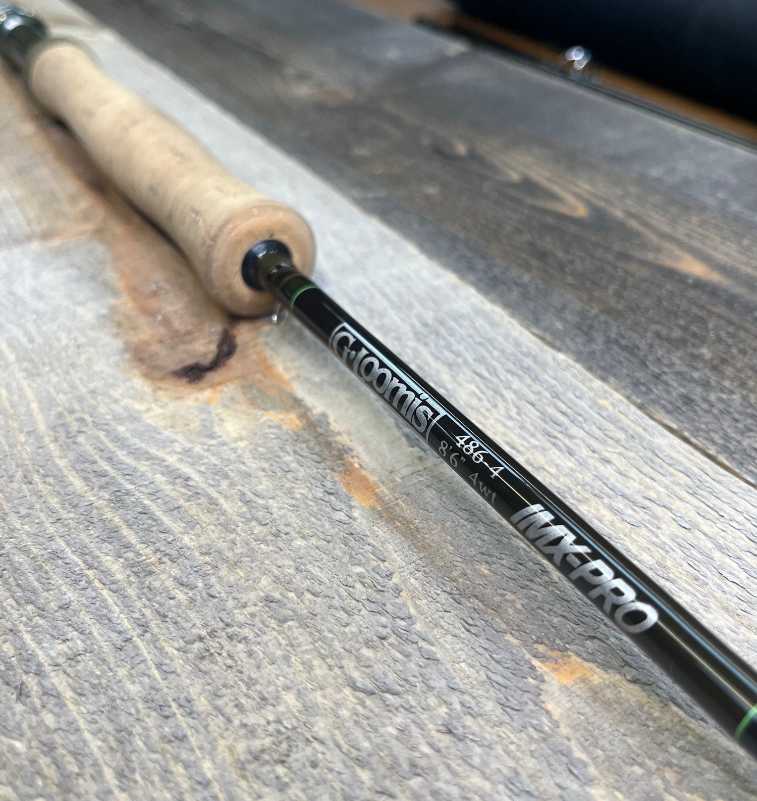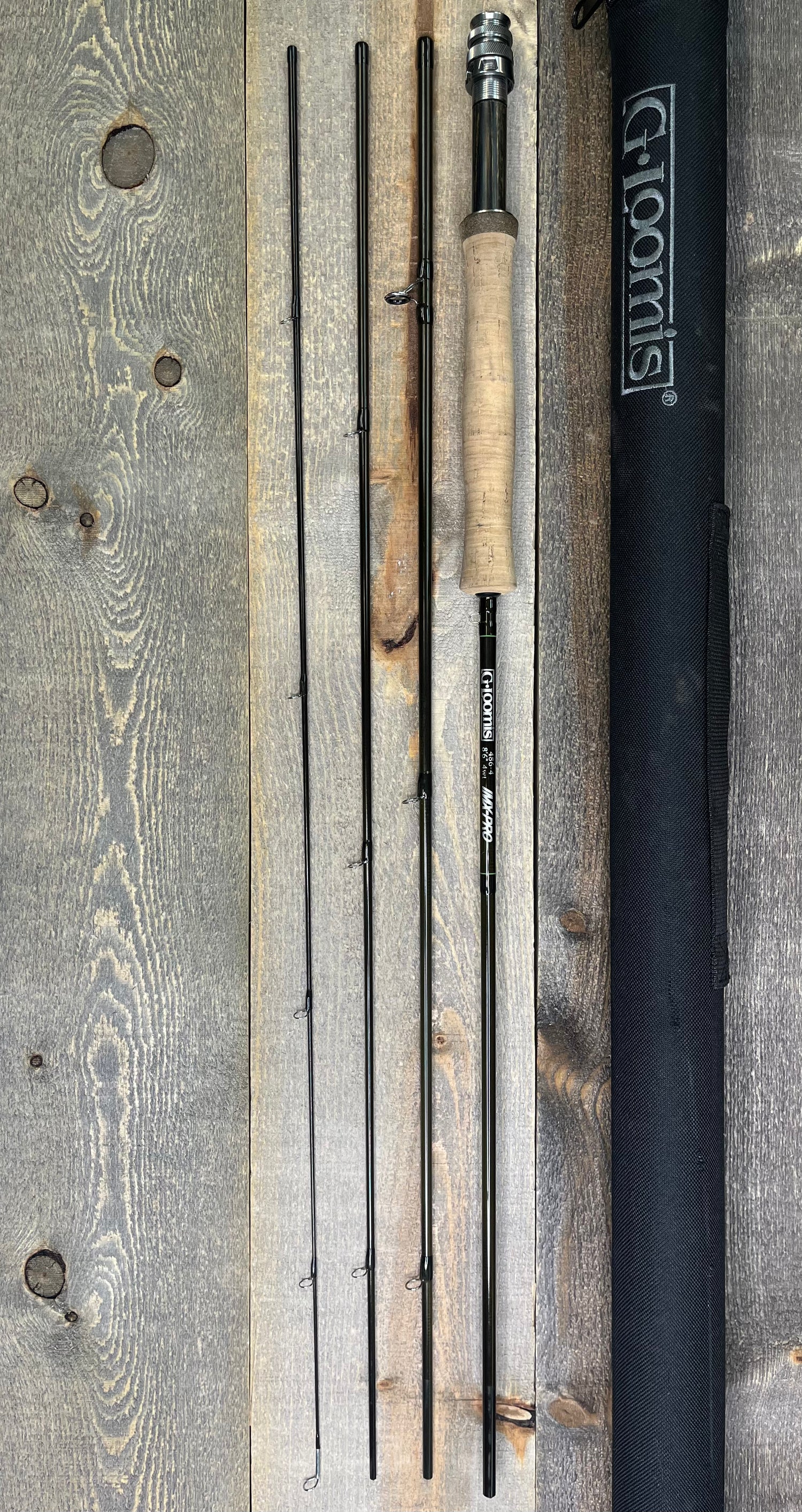 This is a traded-in G-Loomis IMX-PRO rod (4pc, 8'6", 4wt). The rod is in fair condition. The rod tube is scuffed up, and there is no rod sock. The cork is dirty. However, the rod blanks are in good condition. There are a few minor scratches and scuffs, specifically around the connection points of the rod.