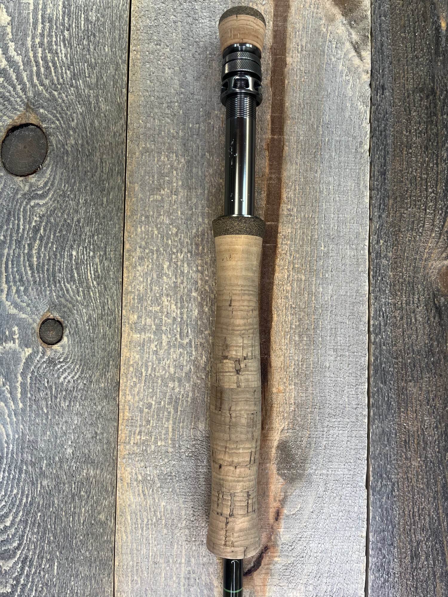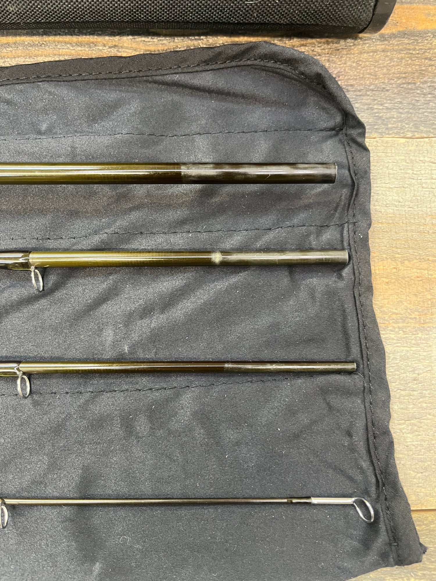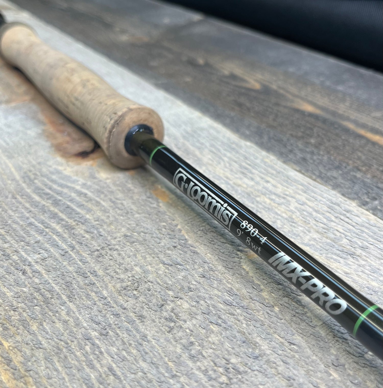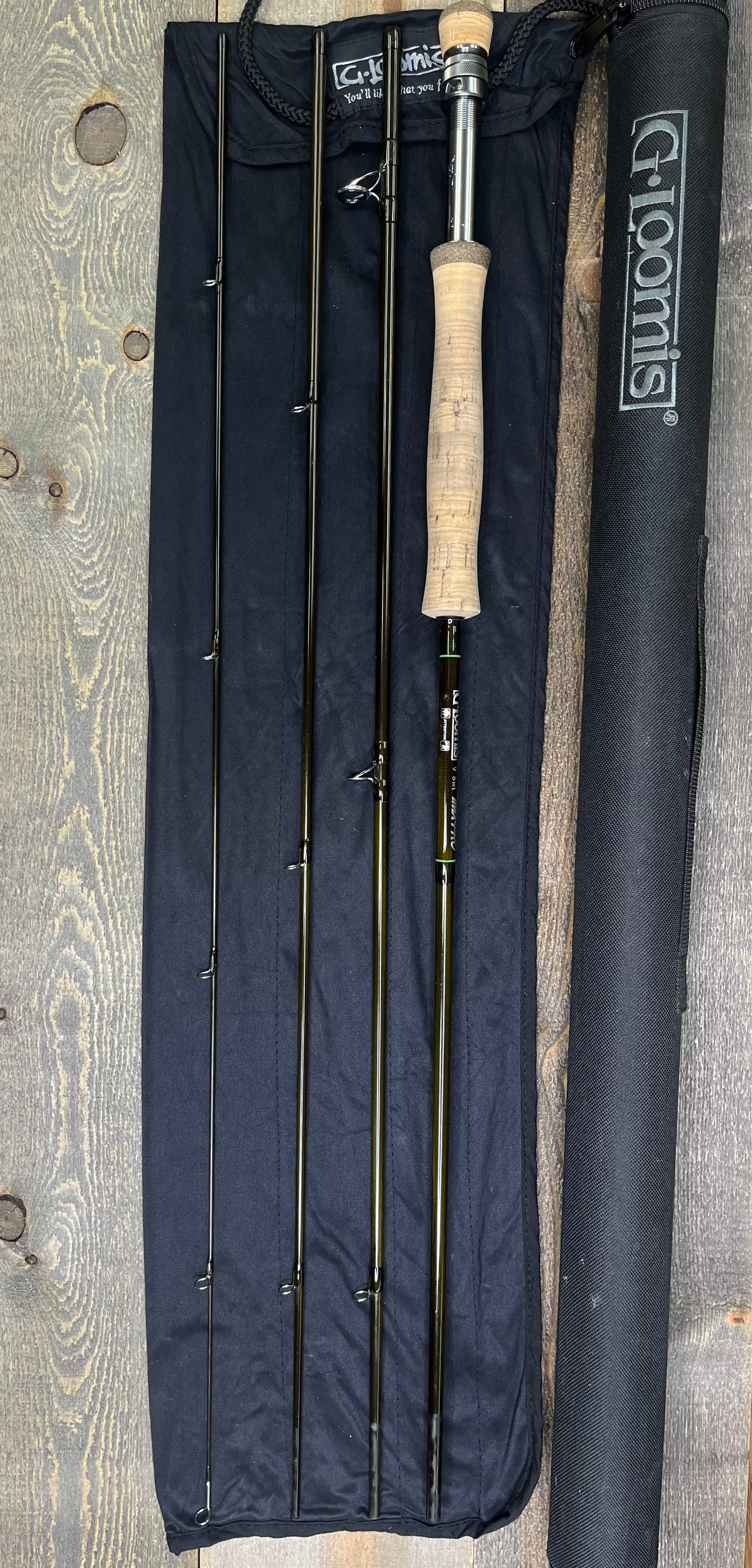 This is a traded-in G-Loomis IMX-PRO (4pc, 9', 8wt). The rod is in fair condition. The rod case has some scuffs. The rod sock is in good condition. The cork is dirty and there are some scratches on the reel seat. There is decent scuffing on the rod blanks, specifically at the attachment points.