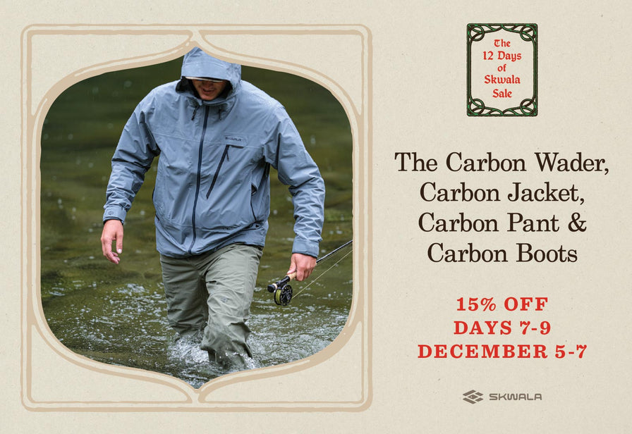 12 Days of Skwala – Quiver Drop #2 (Dec 5–7): Save 15% on Carbon Waders, Jacket, Pant, and Boots, a head-to-toe system designed for brutal weather and big days on the water.