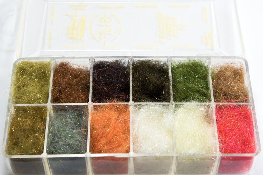 A 12 color dispenser loaded with SLF Dave Whitlock Dubbing. These are Dave Whitlock's Signature dubbing blends. Used to tie Dave's most popular and famous flies, such as the Nearnuff Crayfish. Included in this dubbing assortment are the following colors-