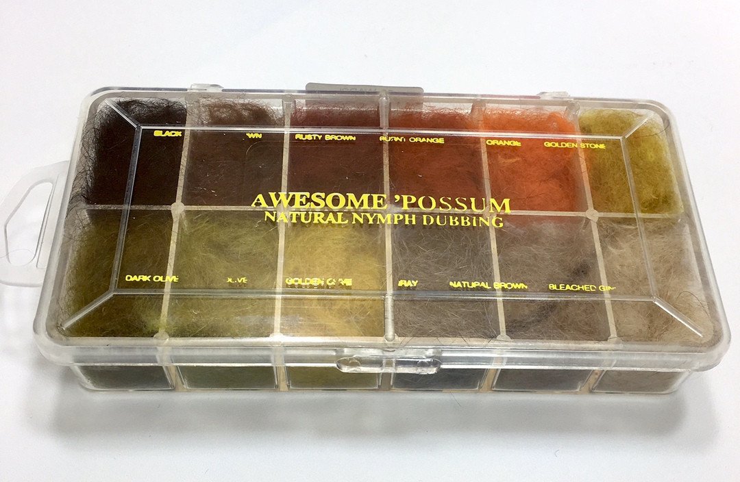 Wapsi Awesome Possum Dubbing is a mix of possum guard hairs and soft underfur. Awesome Possum is a buggy nymph dubbing available in this dubbing dispenser. 12 colors- Orange, Burnt Orange, Bleached Ginger, Gray, Brown, Rusty Brown, Olive, Black, Golden Stone, Golden Olive, Natural Brown, and Dark Olive.