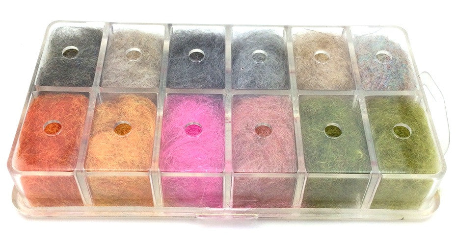 A 12 color dispenser of Wapsi Sow Scud Dubbing. Colors included:
