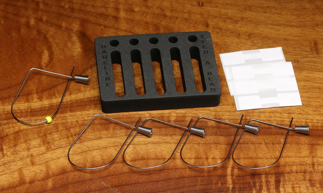 Feed-a-Bead 5 pack with Holder - The Feed-A-Bead Tool System stores, organizes, and acts as a steady, third hand that helps to feed beads onto hooks with remarkable ease. Will work on nearly all styles of beads, cones and larger hooks.