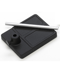 The Renzetti Pedestal Base for the Traveler Series and or the Tube Fly Vise is made out of cast zinc that is then powder coated black. It is approx. 4" wide x 5" long x 1/2" thick and it weights almost 3 pounds. The Renzetti pedestal base comes with a 7" black anodized aluminum stem and a non slip rubber protective pad to keep your vise in place as well as to protect your working surface.