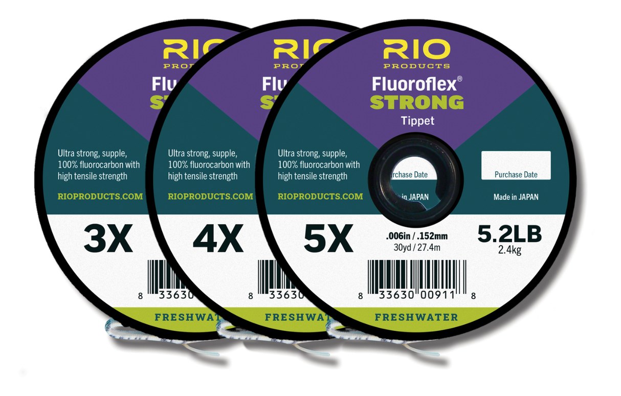 RIO’s newest tippet material is an ultra-strong, 100% fluorocarbon with exceptionally high tensile strength. The material is very easy to tie knots in, with high knot strength and a smooth finish that ensures knots seat easily and tightly. The high break strength to diameter ratio makes this a fantastic fluorocarbon for the trout fly fisher. RIO is proud to introduce “half sizes” of core trout diameters, giving anglers an extra choice when faced with the decision to choose between, say 4X and 5X. Our new 6.5X, 5.5X and 4.5X sizes will make those decisions easier. Each spool has 30 yards of top quality material spooled on, though for those who use a lot of fluoro, our Guide spools each have 100 yards spooled on. We also offer Fluoroflex Strong in a “3-Pack”, which includes three, 30-yard spools of tippet packaged in a reusable, clear plastic cup. The 3-Packs are available in both a 4X, 5X, 6X option, & a 3X, 4X, 5X option.